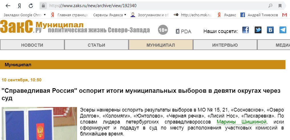 " Эсеры намерены оспорить результаты выборов в МО № 15, 21, "Сосновское", "Озеро Долгое", "Коломяги", "Юнтолово", "Черная речка", "Лисий Нос", "Пискаревка". По словам лидера петербургских справедливороссов Марины Шишкиной, иски сформируют и подадут в суд по месту расположения участковых комиссий в ближайшее время..."