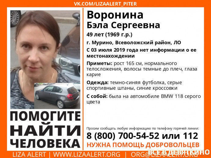 Ранее сообщали о том, что вечером 3 июля женщина села в свой автомобиль «БМВ» у дома №23 по улице Шувалова и с тех пор ее никто не видел. Все это время Бэллу искали не только сотрудники полиции, но также родные, волонтеры «ЛизаАлерт» и неравнодушные жители Мурино.