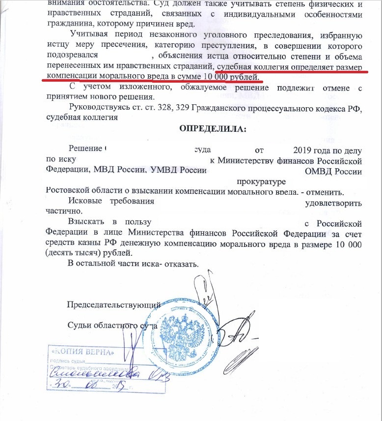Дальше, будучи абсолютно уверенным в своей правоте, я подал апелляцию в областной суд. И, конечно же, апелляция полностью отменила решение районного суда, признала причинение морального вреда моему клиенту и взыскала в его пользу компенсацию этого вреда.
