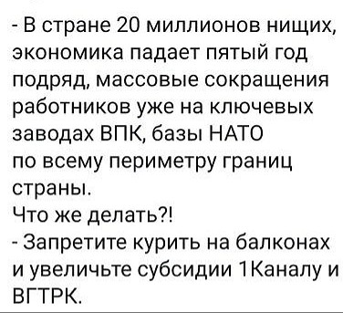 Если вам странно то, что леса горели в Сибири, а курить запретили на балконах, то ответ лежит на поверхности, дело в том, что тушить тайгу экономически не выгодно, а штраф за курение на балконе очень даже выгодно...