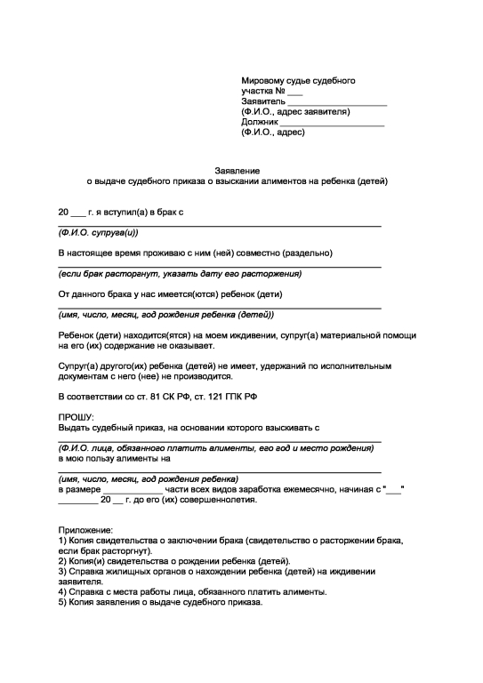 Образец заявления о выдаче судебного приказа о взыскании алиментов
