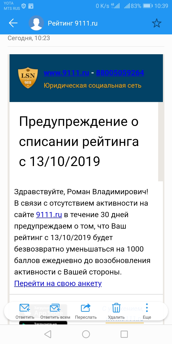 Уважаемый Роман Владимирович! Если Вам не интересен рейтинг, то зачем Вы вообще откликнулись на это письмо? Рейтинг существует для тех, кому он важен. Это измеритель активности пользователей. После нашей рассылки сотни людей вернулись на сайт и возобновили активность. На 9111.ru по-прежнему достаточно юридических тем, из 300 публикаций в сутки, как минимум, 200 посвящены правовой тематике. Можно заобсуждаться, чего и Вам желаю! С уважением!