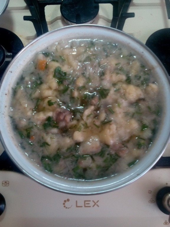Когда бульон почти сварился добавить в него картофель морковь, лук. Варить помешивая и постоянно пробуя на соль, где то минут через двадцать начать зачерпывать жидкое тесто и опускать его в бульон, где оно сварившись станет подобием комочков (галушек по венгерски).