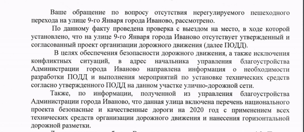 Как видно из ответа, судя по штампам из УМВД РФ по Ивановской области - на ул. 9 го Января отсутствовал даже сам проект организации дорожного движения-то есть организация дорожного движения на этой улице вообще не организовывалась, как будто этой улице не было вообще, хотя я напомню, что эта улице расположена в самом центре г. Иваново - в 100 метрах от суда, 250 метрах от прокуратуры и менее чем в 1 км от ж.д. вокзала г. Иваново.