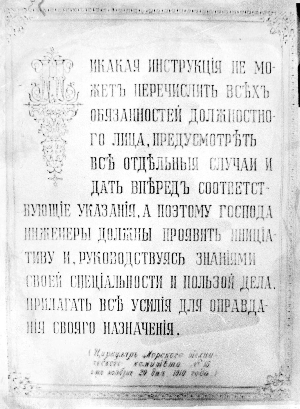 Завершить исследование невероятных прожектов Российского Императорского флота хотелось бы одним документом. Морской технический комитет Морского министерства России, во многом унаследовавший функции Морского ученого комитета 29 ноября 1910 г. издал циркуляр № 15 следующего содержания: «Никакая инструкция не может перечислить всех обязанностей должностного лица, предусмотреть все отдельные случаи и дать впредь соответствующие указания, а поэтому господа инженеры должны проявить инициативу и, руководствуясь знаниями своей специальности и пользой дела, прилагать все усилия для оправдания своего назначения».