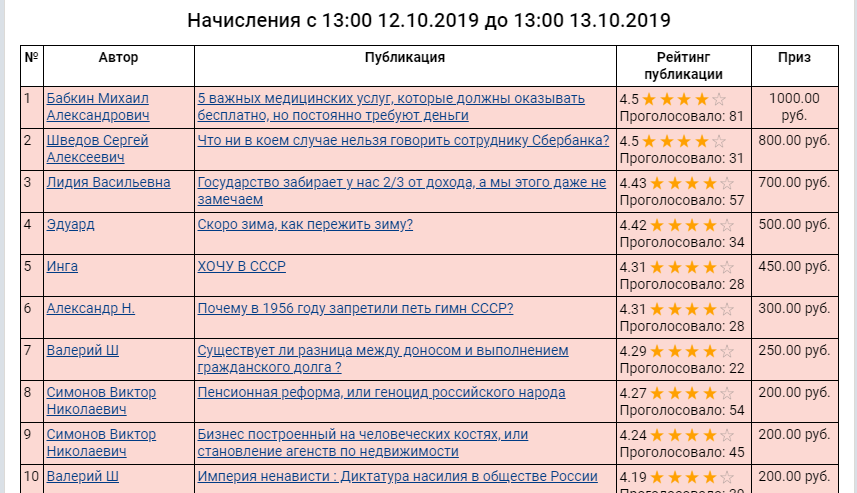 Поскольку при равенстве оценок выше в рейтинге будет статья, набравшая большее количество оценок от разных пользователей. А если вдруг эти показатели окажутся одинаковыми? Скажете что это маловероятно. А вот и нет. На второй день такое уже произошло. Сравните 5 и 6 место в таблице.