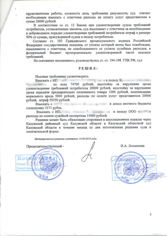 В результате, суд вынес решение в пользу нашего клиента. Помимо уплаченной за товар суммы (74 700 руб.), продавец обязан выплатить покупателю понесенные клиентом расходы на юридические услуги (20 000 руб.), а также штраф, неустойку и моральный вред на общую сумму 76 350 руб. (что больше чем стоимость самого кухонного гарнитура).