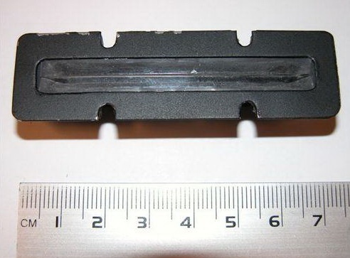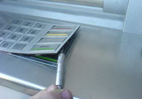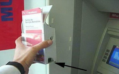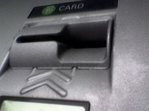 1. На технологическое отверстие (щель) картридера, в которое вставляется карточка. Поверх него может быть установлена фальшнакладка – скиммер. Эта накладка обычно отличатся по цвету (может быть черного цвета или свежевыкрашенной под цвет картридера). При наличии накладки движение карты в банкомат может проходить затрудненно, не так как обычно.