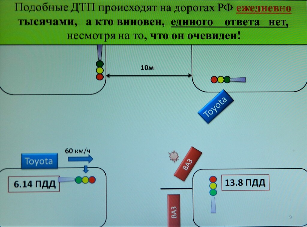 Водитель Тойоты пишет: «Я двигался со скоростью 60 км/час, горел зеленый, приближаясь к стойке светофора – загорелся желтый. Согласно п.п. 6.14 и 13.7 ПДД, я решил проехать, но для водителя ВАЗа загорелся зеленый и он, не уступая мне дорогу, выехал на перекресток и перекрыл мне дорогу. Мы столкнулись. Считаю, что виновен - водитель ВАЗа, который, согласно п. 13.8 ПДД, обязан был уступить мне дорогу».