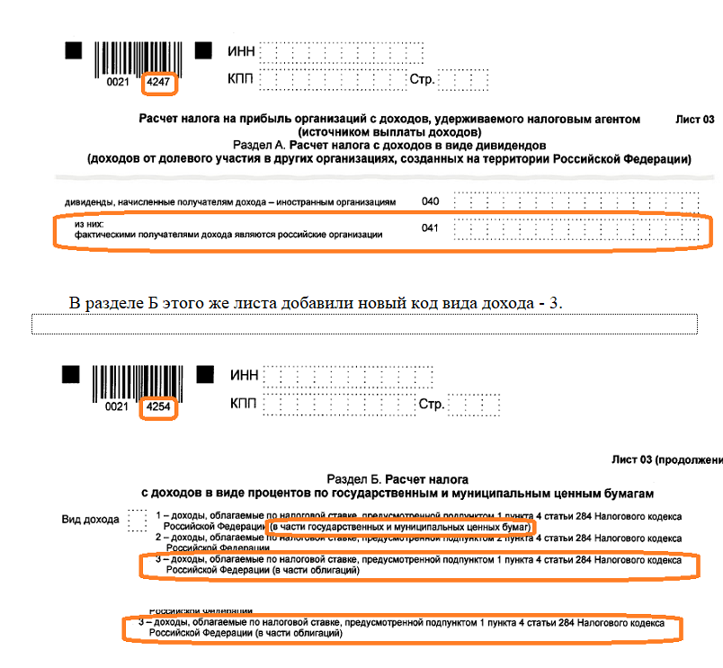 Новую строку 041 включили в раздел А листа 03 декларации. В ней нужно показывать начисленные иностранным компаниям дивиденды, фактическими получателями дохода по которым являются российские организации.