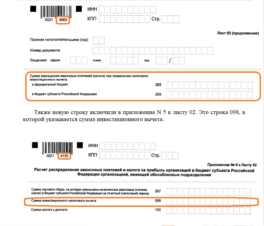 Кроме того, новыми строками 268 и 269 дополнено продолжение листа 02. В них нужно указывать сумму, на которую уменьшены авансовые платежи или налог из-за применения инвестиционного вычета: в первой строке - в части, приходящейся на федеральный бюджет, во второй - на региональный.