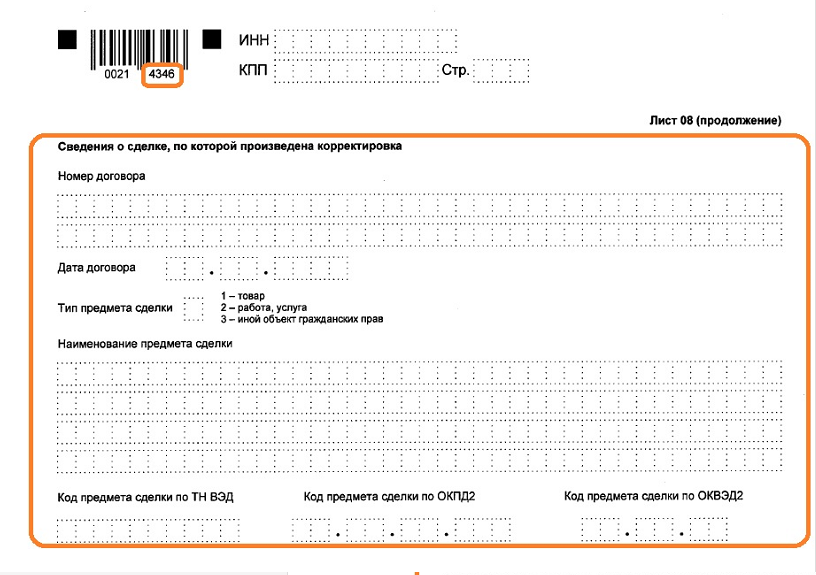Поправки затронули лист 08, заполняемый при самостоятельной (симметричной, обратной) корректировке. В этом листе появилось место для указания сведений о сделке, по которой произведена корректировка. К таким сведениям относятся, например, номер и дата договора.