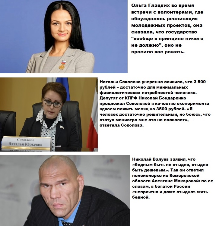 Это милейшая уже евгеникой попахивает... Вы часом не из тех медиков, кто во время третьего рейха в концлагерях работали? Вот я с почтением отношусь и к уборщика и к землекопам, как Вы изволили выразиться, с почтением отношусь ко всем людям которые своим трудом физическим ли умственным ли зарабатывают себе на жизнь! Трудом, а не воровством, противоправными комбинациями, и при этом вещает, что на 3000 выжить можно... выжить можно, а жить нельзя... нельзя половину населения держать в бедности и безнадеге, чревато знаете ли, но история проучивает тех кто ее не учит... от бедности и безнадеги люди тупеют, как Вы выразились, у них руки опускаются, оттого и грязь и алкоголь дешевенький, и отравления и болезни и за детьми недосмотр... нельзя для того чтоб жирел 1% держать в дерьме 99%