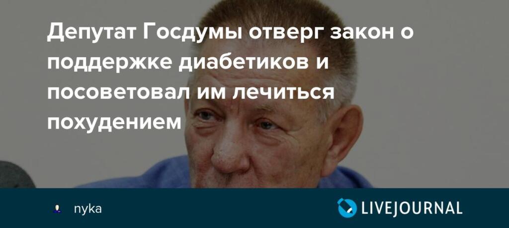Отклоняя законопроект о поддержке диабетиков народный избранник Николай Герасименко заявил: "Я знаю нескольких депутатов нашей Госдумы, которые имели сахарный диабет и сидели на инсулине, похудели на 30-40 килограмм и перестали принимать инсулин и так далее. Поэтому кто не хочет болеть сахарным диабетом, нужно заниматься собой", - добавил слуга народа. Кто и каким образом все же смог излечится от хронического неизлечимого заболевания доктор медицинских наук Герасименко не пояснил...