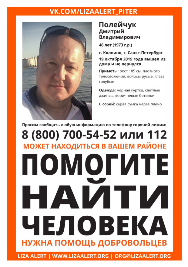 Об исчезновении Полейчука сообщил поисковый отряд «Лиза Алерт», разместивший ориентировку вечером 28 октября. «19 октября вышел из дома в Колпино и не вернулся», – говорится в сообщении, к которому прикреплено изображение Полейчука.