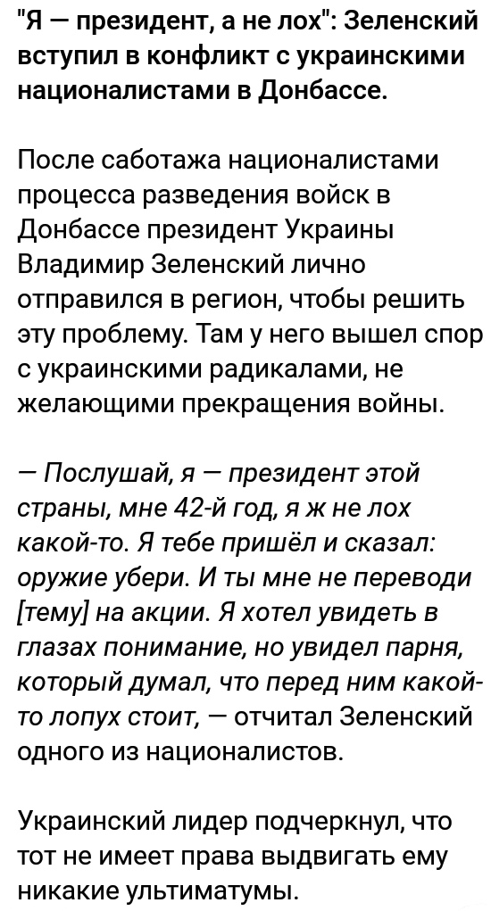 Вот это мОлодец Зеленский! С врагом лицом к лицу! Небось нацик не ожидал такого поворота?