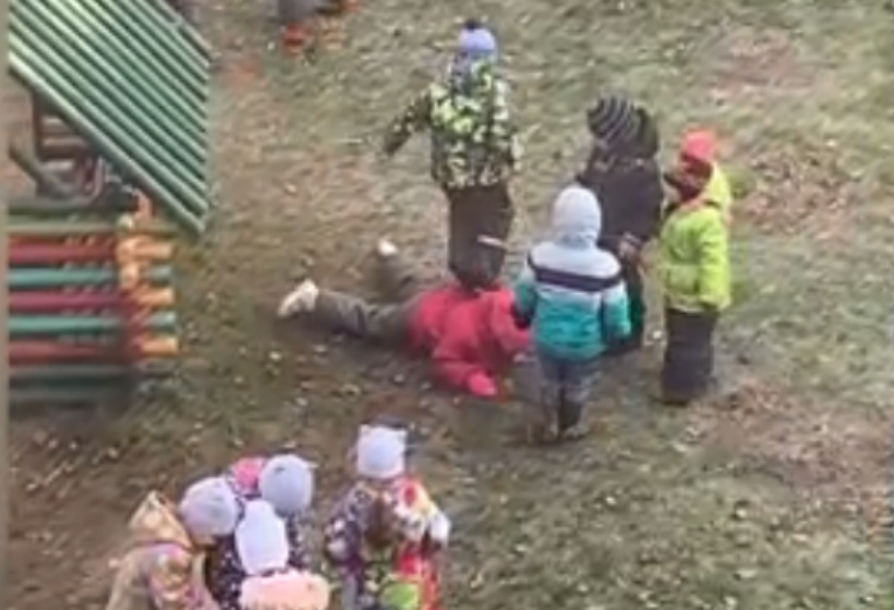 Сообщается, что несколько детей напали на девочку, повалили ее на землю и начали пинать. Примечательно, что все это происходило на глазах у воспитателя. На кадрах можно увидеть, что преимущественно мальчики ходят по лежащей на земле девочке, тычут ее лицом в землю, наносят удары руками, пинают.