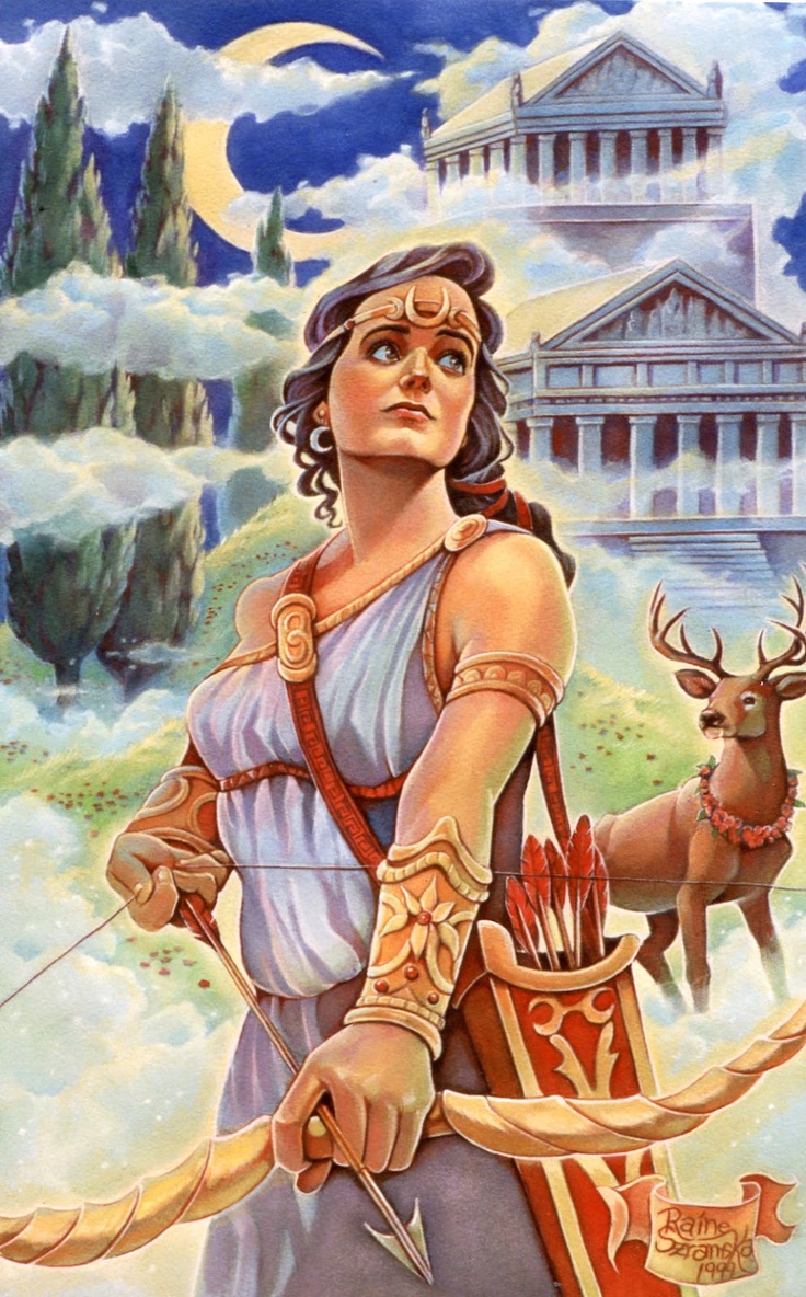 Артемида решила стать похожей на богиню любви Афродиту: она выбросила лук и стрелы, надела полупрозрачную тунику, отпустила своих верных нимф - охотниц, а наняла служанок: парикмахерш, косметичек и маникюрш.