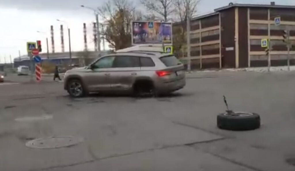 Сегодня утром в Кировском районе Петербурга кроссовер «Шкода» потерял колесо, причем причина поломки явно не в том, что работники шиномонтажа плохо закрепили болты.