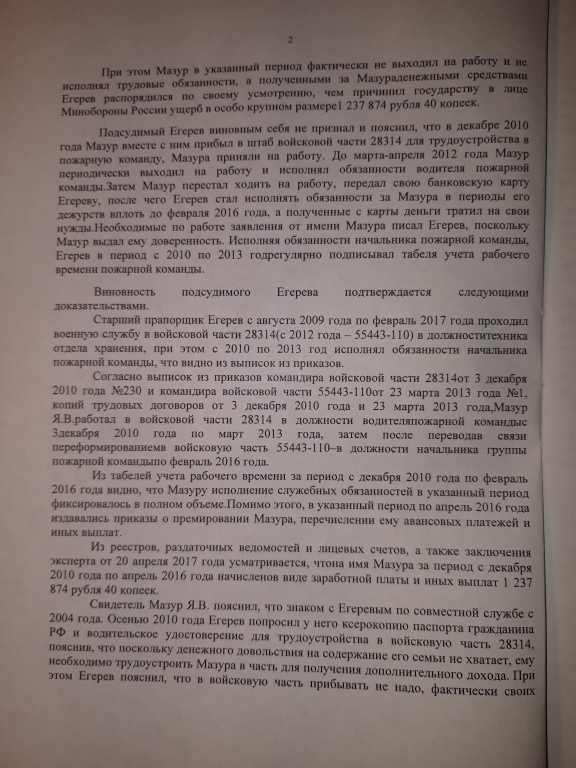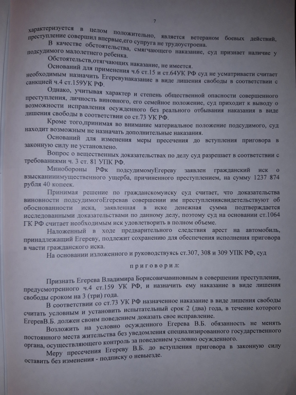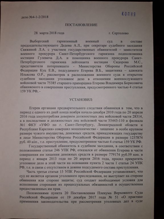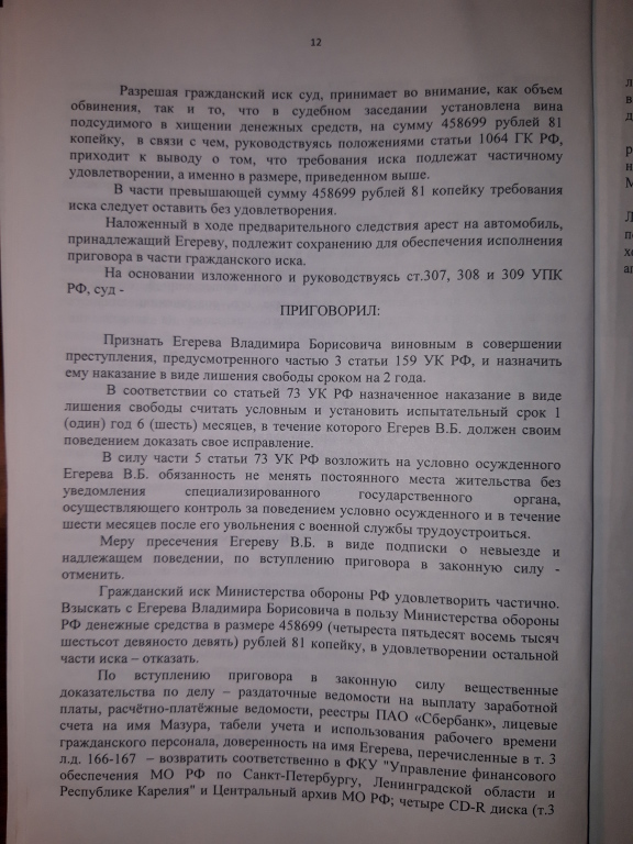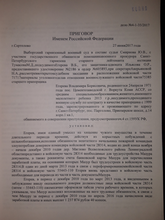 Приговором Выборгского гарнизонного военного суда от 27.06.2017 года прапорщик Егерев признан виновным в совершении мошенничества в особо крупном размере, которое он совершал с декабря 2010 года по апрель 2016 года, всего на общую сумму – 1 237 874 рубля. Ему назначено наказание – 3 года лишения свободы условно с испытательным сроком – 2 года. Полностью удовлетворен гражданский иск министерства обороны на указанную сумму.