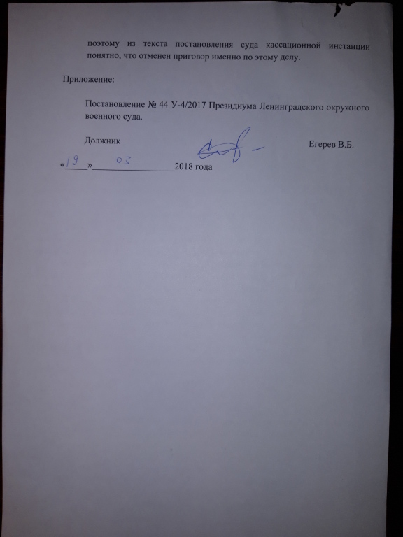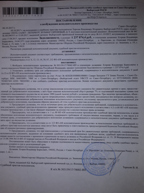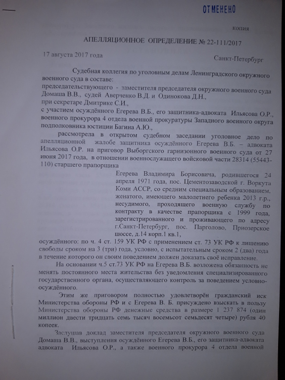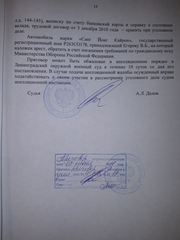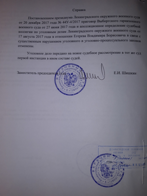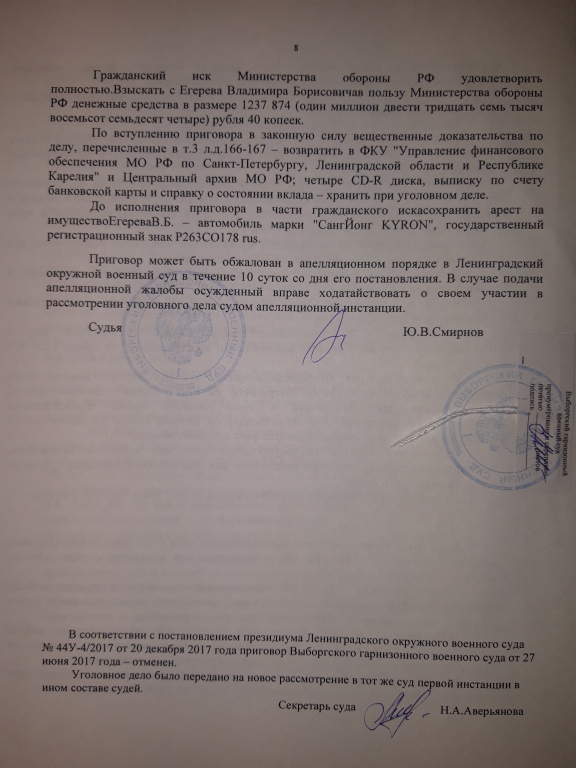 Апелляционным определением Судебной коллегии по уголовным делам Ленинградского окружного военного суда от 17.08.2017 года, приговор оставлен в силе, апелляционная жалоба без удовлетворения. Выборгским РОСП УФССП по Санкт-Петербургу возбуждено исполнительное производство по взысканию с Егерева причиненного министерству обороны ущерба.