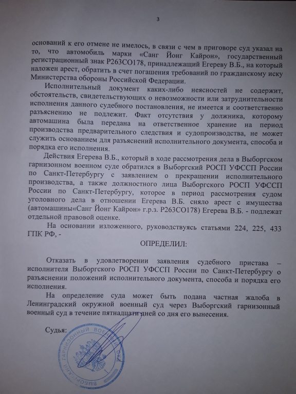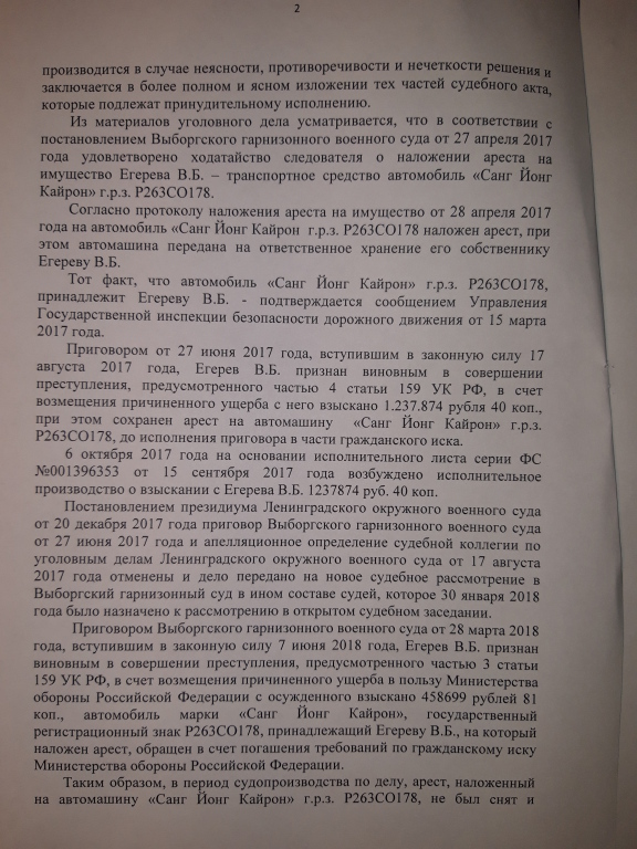 Судебный пристав-исполнитель Выборгского РОСП УФССП по Санкт-Петербургу обратилась в Выборгский гарнизонный военный суд о разъяснении исполнительного документа об обращении взыскания на автомобиль, которого у Егерева уже нет, но определением суда от 11.10.2018 года ей было в этом отказано.