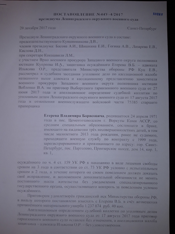 Постановлением Президиума Ленинградского окружного военного суда от 20.12.2017 года, вынесенным по результатам рассмотрения нашей кассационной жалобы, приговор и апелляционное определение отменены, дело направлено на новое рассмотрение в тот же суд.