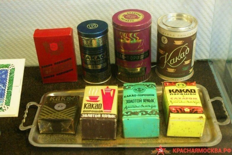 А вот какао не было в дефиците. Самой популярной была упаковка какао-порошка в зеленой пачке. На фото вторая справа в нижнем ряду.