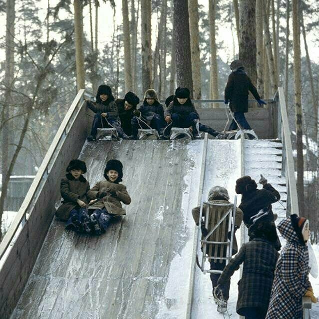 На ледяную горку с санками мы не пускали, кто постарше на ногах катались, малышня на картонках, портфеле или на собственном ботинке.