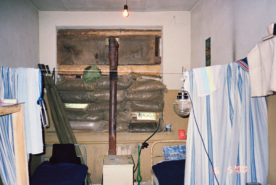 «Центром нашей базы была, если можно так выразиться, "цитадель", — двухэтажный кирпичный дом на улице Кирова. На втором этаже размещался мой медицинский пункт, где стояла моя койка и койка для пациента, но ее занимал прибывший позднее коллега. Рядом, за стенкой, с одной стороны размещалась радиорубка, служащая одновременно жилищем для связистов, а с другой стороны — офицерский клуб-кубрик. Это были мои соседи: ротные Боря, Саша, Миша и офицер-компьютерщик Сергей (без компьютера теперь нигде нельзя, даже на передовой). Кроме того, на втором этаже было три кубрика личного состава отряда.Довольно широкая лестница без перил вела вниз, где размещался штаб, склад вооружения и боеприпасов, три жилых кубрика для бойцов, среди которых разместились мои славные вагонные соседи — гитарист Сергей Король со своими друзьями. А еще на первом этаже был клуб-столовая с телевизором и видеомагнитофоном (фильмотека благодаря спонсорам была обширная, каждый день можно было смотреть новое кино).Все оконные проемы у нас были заложены мешками с песком. Мешки прикрывали и вход в здание, а на крыше из железнодорожных шпал была сложена башня кругового наблюдения с пулеметным гнездом под названием "голубятня". Доброй приметой нашего пребывания всеми, за исключением меня (по причине вопиющей антисанитарии), расценивалось наличие в здании ласточкиных гнезд, в которых пищали вечно голодные птенцы. Нахальные ласточки влетали через амбразуры и гадили где попало».