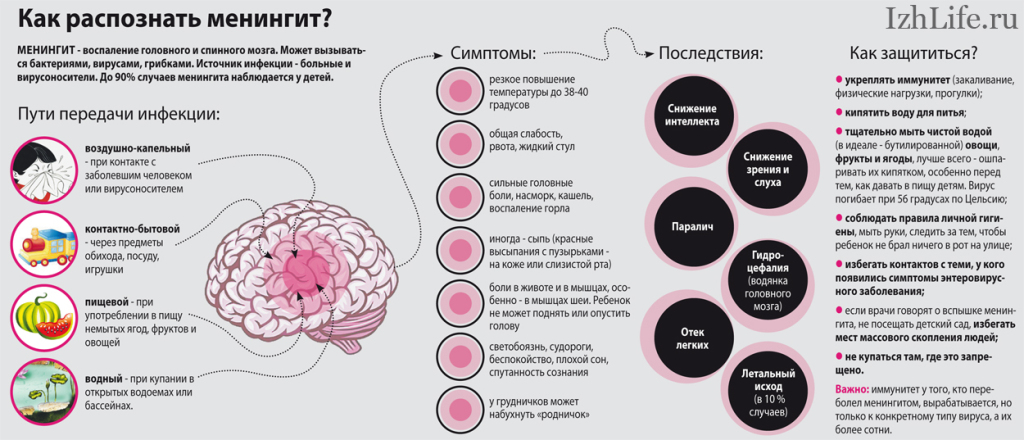 Признаками инфекции являются тошнота, сильная головная боль, многократная рвота. Но несмотря на страшное название и резкое начало заболевания, сознание нарушается не сильно, протекает такой менингит недолго и заканчивается без последствий — в основном уже через десять дней.