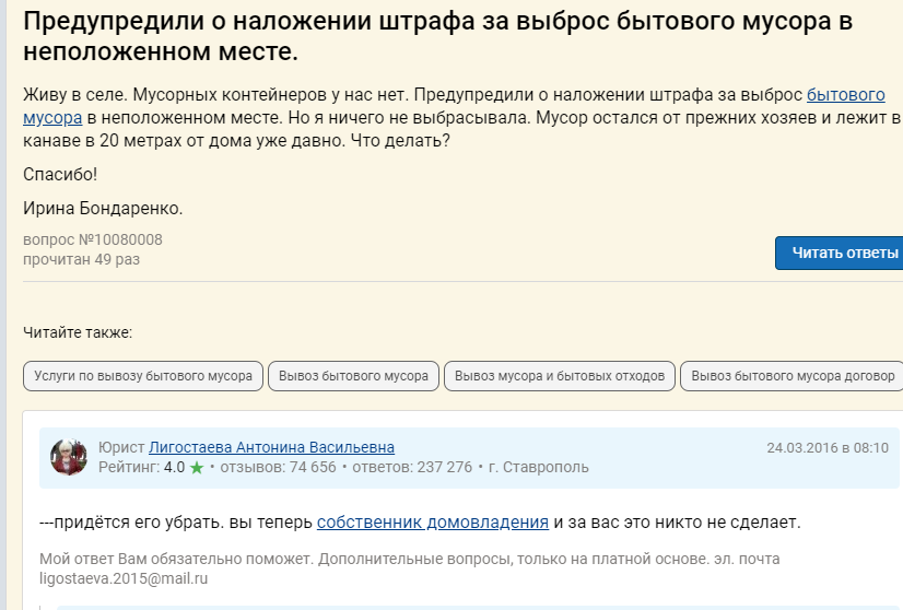 Вот такая история вышла со мной три года назад. К моему частному дому подъехала машина лесного хозяйства, вышли двое мужчин — один, в форме инспектора охраны леса, подошёл ко мне, другой, в гражданской одежде, побежал с фотоаппаратом в сторону рва, в метрах 20 от дома. Я у инспектора спросила, что происходит, и был получен ответ — сейчас узнаете!... Подошёл мужчина с фотоаппаратом, и не представившись, начал меня прессовать... Дескать, почему я выбрасываю мусор и скорее всего (!?) выливаю туда же помои... Я ответила, что мусор не мой, а прежних хозяев дома, и соседи накидали. Прежние хозяева в ров выбросили всё, что не взяли с собой — кастрюли, банки и т.п. У меня дом со всеми удобствами и мне нет нужды куда то ходить, что то выбрасывать...