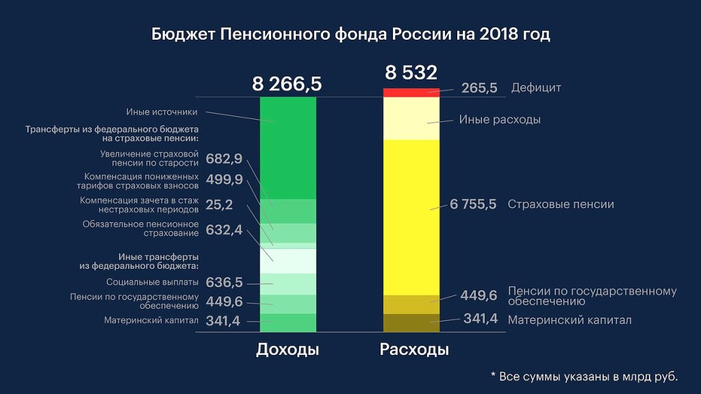 Из-за чего весь этот сыр бор про увеличение пенсионного возраста? Последние годы отчисления от работающих в ПФР меньше затрат на выплату пенсий. Если раньше хватало на выплату пенсий и ее же хватало на строительство замков ПФР (посмотрите в интернете какие здания ПФР были построены) и очень приличные зарплаты работникам этого фонда, то с 2015 года появился дефицит бюджета. Причем имея дефицит бюджета за 2018 год в размере 265 млрд рублей, на так называемые «другие расходы» был потрачен почти триллион рублей, тогда как на пенсии, материнский капитал и гос. пенсии были потрачены 7,5 триллиона рублей. Таким образом денег не хватает именно на «дополнительные расходы», потому что поступления в размере 8.266 триллионов рублей вполне хватало на пенсии и прочее. Ну да ладно, может «дополнительные расходы» и вправду жизненно необходимы ПФР.