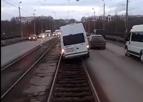 Проезд трамвая по Ленинградскому мосту оказался заблокирован из-за микроавтобуса, водитель которого решил ехать не по дороге, а по рельсам. Несколько минут вагону пришлось тащиться за упрямой маршруткой.