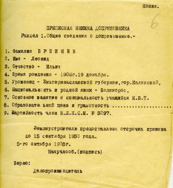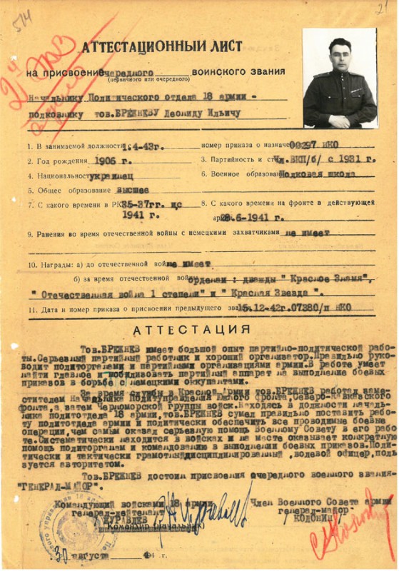 Аттестационный лист Л.И. Брежнева на присвоение очередного воинского звания.
