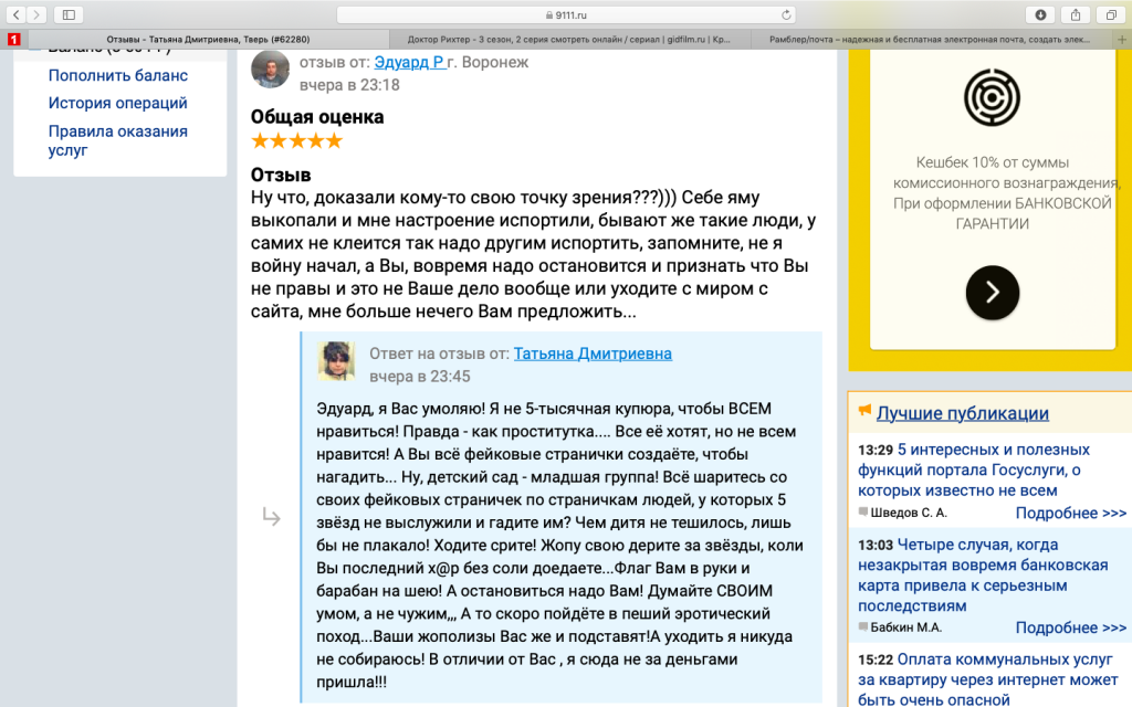 Зайдите на страничку Сергея и посмотрите его публикации! У него один единственный комментарий! Один! И, о, БИНГО! Этот комментарии у меня! Сегодня 13.11.2019, а зарегистрировался этот Сергей только лишь 12.11.2019! И откуда ему знать, что на сайте уже ТРИ статьи по этой теме? Я этого не знаю/, а он, тот который меньше СУТОК на сайте - ЗНАЕТ! И потом, кроме Эдуарда, я в личке НИ С КЕМ НЕ ОБЩАЛАСЬ последнее время! И именно от него шли угрозы ОБОСРАТЬ... И сегодняшний отзыв, чтобы я с миром ушла... ДА, с какой стати? Он специально и статей сегодня не крапал, чтобы алиби себе создать... Но, не вынесла душа поэта, и он рванул на сайт!