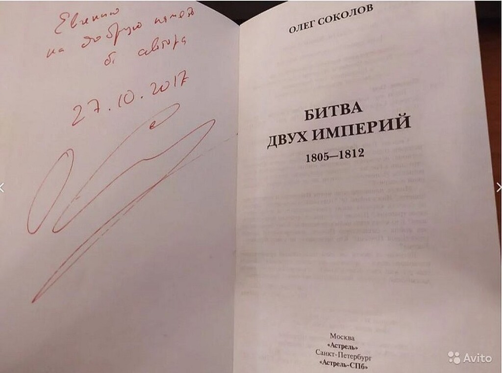 Книга «Битва трёх императоров. Наполеон, Россия и Европа. 1799—1805 гг.» продаётся за 30 тыс. рублей. По словам автора объявления, на одной из страниц издания присутствует оригинальная подпись историка, которая датирована 25-м мая 2019 года и адресована некоей Татьяне.