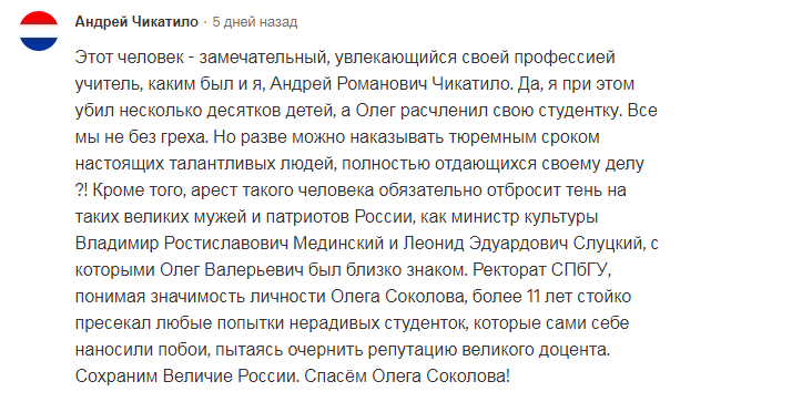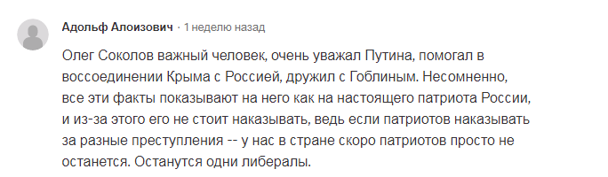 Я зашел на этот сайт почитать о том, кто вступается за Олега Соколова, и как для меня ожидаемо оказалось, среди тех кто его поддерживает, есть немало тех, кто судя по комментариям придерживаются курса действующей власти. Подробнее здесь: