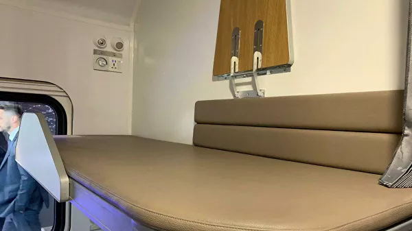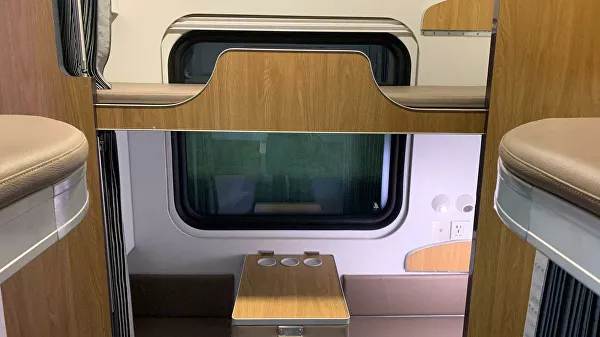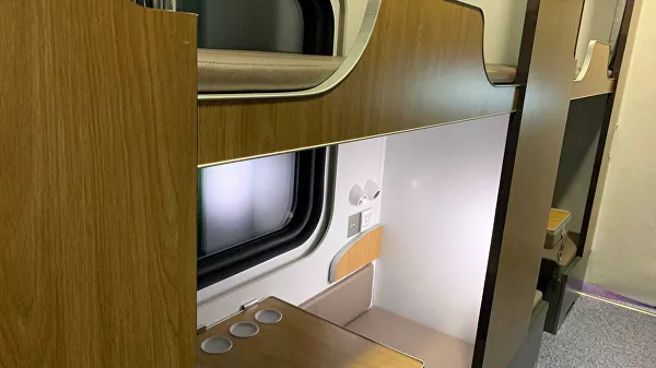 По сути, это привычный плацкартный вагон, но с индивидуальным пространством: там, где полки разделены перегородкой в виде шкафа, получается что-то вроде купе, кроме того, у каждого пассажира будет свой личный стол и шторки на полках. Стены выполнены в светлых тонах, полки — в бежевых.