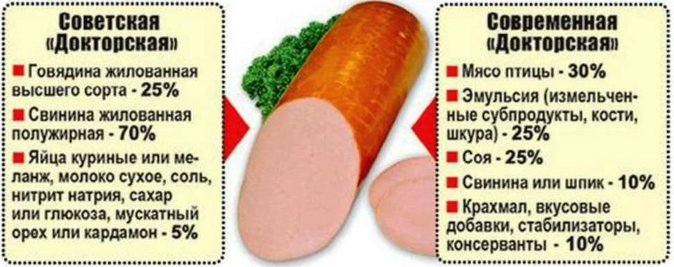 В докторскую колбасу входило: говядина, свинина, сухое молоко, меланж, мускатный орех, нитрит натрия и больше ничего! Смекаете?