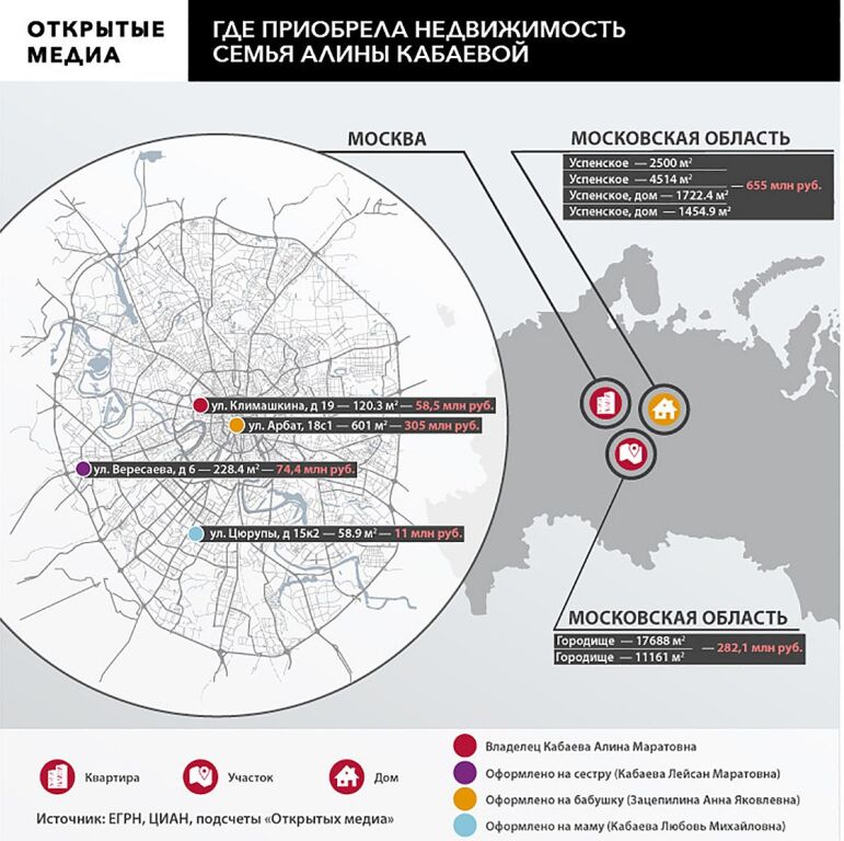 С учётом объектов, о которых СМИ писали раньше, на Кабаеву и её родных оформлены шесть квартир в Москве и Санкт-Петербурге, два дома и 70 соток земли; суммарная рыночная стоимость, как подсчитали «Открытые медиа», сейчас может составлять около 1,25 млрд рублей (при оценке не учитывалась цена уже проданной газпромовской земли в Городище). В большинстве случаев речь идёт о недвижимости в закрытых населённых пунктах, а предыдущие владельцы имеют отношение к «Газпрому»: это либо влиятельные предприниматели, прямо или через своих основных партнёров по бизнесу связанные с газовым монополистом, либо структуры самой госкомпании.