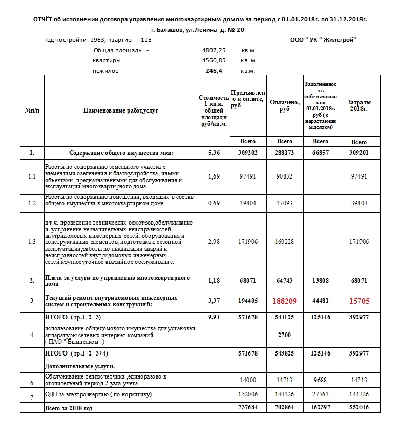 Ниже представлен отчет об управлении за 2018 год дома по адресу, город Балашов, ул. Ленина, 20.