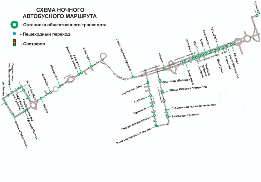 Маршрут ночного автобуса получил номер 1 Н. Отправной точкой для движения станет остановка "Промпарк" в п. Северный, далее по пр. Б.Хмельницкого, пр. Славы, до железнодорожного вокзала, оттуда через ул. Преображенскую на Харьковскую гору. По Харьковской горе автобус будет делать круг по ул. Щорса, ул. Конева, ул. Будённого, ул. Губкина, ул. Щорса с возвращением по пр. Б.Хмельницкого.
