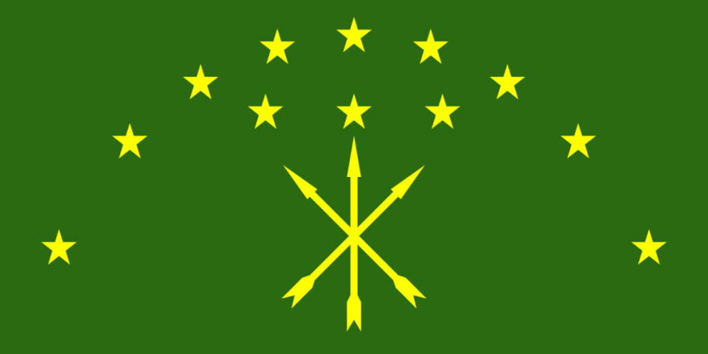 Три флага, флаг Украины с гербом, гербы Рюриковичей, флаг Черкесами и флаг адыгов Кайтукина 16 века, наверху герб в виде трезубца с затупленными концами.