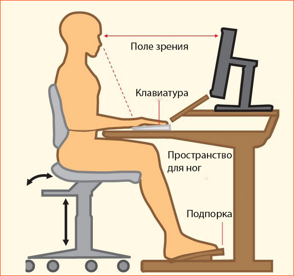 Чтобы избежать проблем, связанных со зрением, монитор должен стоять не ближе чем в 45 сантиметрах от глаз, а верхняя точка монитора должна быть не ниже уровня глаз. Экран монитора не должен быть повернут в сторону окна (слева). В темное время суток, работать с компьютером, где единственным источником света является монитор, нельзя.