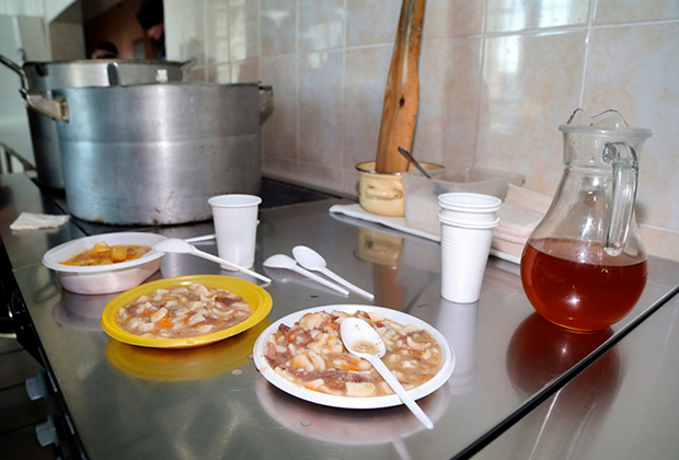 Кормят заключенных в ИК-6 трижды в день, их рацион составляют каши, борщ, макароны по-флотски, рыба и тушеные овощи. Повторять одно и то же блюдо допускается не более трех раз в неделю. На каждого зэка в «Снежинке» приходится по 90 граммов мяса ежедневно. Работают на кухне и раздают еду 47 осужденных за мелкие преступления, которых специально доставили в ИК-6.