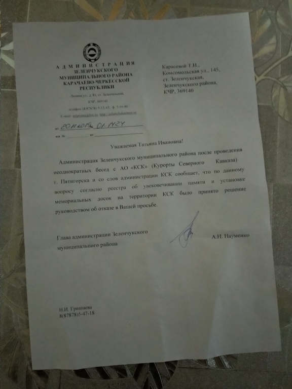 Знаете, Марат Марсельевич, глава администрации после наказания по-своему отомстил: отменил решение президента республики по увековечению памяти моего покойного мужа и его друга, внесших большой в развитие горнолыжного спорта (телеканал "Архыз-24" передача "Жизнь, достойная человека. Горнолыжники." За 17.12. 2017 год). До момента наказания звонили несколько раз из администрации и говорили, что Архыз дал добро и работают над эскизом.