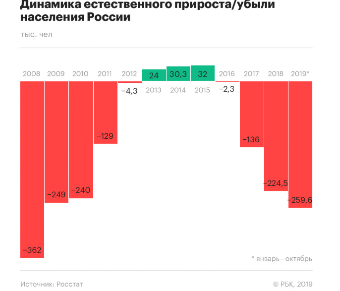 За январь—октябрь 2019 года естественная убыль населения России, то есть превышение числа умерших над числом родившихся, составила 259,6 тыс. человек, следует из данных Росстата. Это означает, что по итогам текущего года убыль в стране станет самой высокой за 11 лет, выше этот показатель был только в 2008 году — 362 тыс. человек.