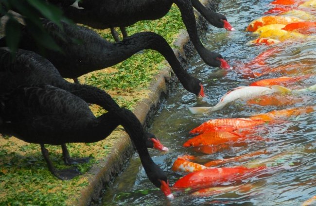 Лебеди пьют воду, а до этого ели, клюв в воде обмывается и рыбка ест.