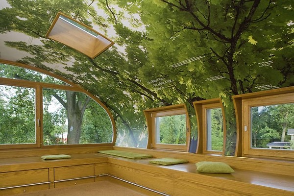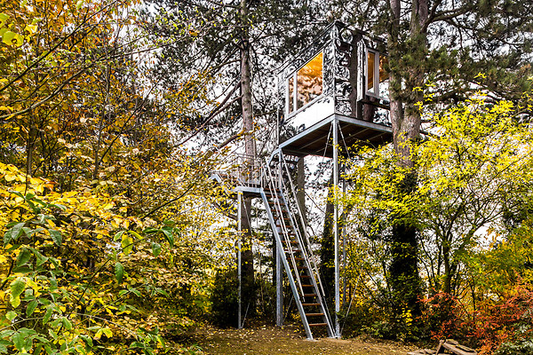 Проект реализован в живописной сосновой роще возле города Хайльбронн. Эта кубическая конструкция опирается и на древесные стволы, и на стальные сваи. Снаружи не стекло, а листы отполированной до блеска нержавеющей стали. Благодаря зеркальным поверхностям создается эффект невидимки. Внутри же куб отделан натуральным деревом. Интерьер лаконичен, вдоль стен расположены раскладные диваны, а громадные окна позволяют любоваться природой из любой точки помещения.
